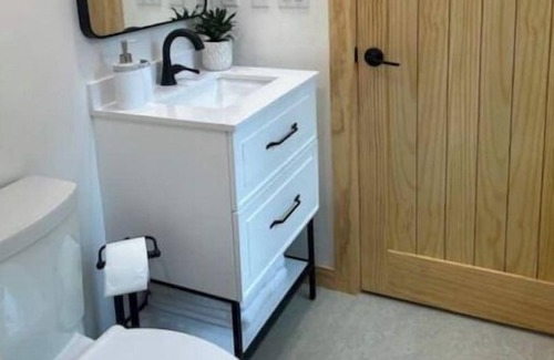 This stunning new construction (July 2023) is a single bedroom property that can sleep up to 4 guests, with 1 queen bed and a memory foam sofa bed in the living space. The cabin has a full bathroom with a soaking bathtub. Both the bedroom and main living areas have celings fans. We have two cabins available for a total of 8 guests, rent them both!. Enjoy your morning coffee on the front deck and roast s'mores in the evening at the fire pit!