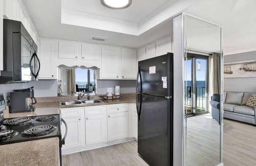 Located on the 6th floor, this condo is tastefully decorated with cute furnishings and finishing touches that provide a breezy, beachy atmosphere that you'll quickly fall in love with. Floor to ceiling windows and sliding glass doors in the living room and dining area let in an abundance of natural light and provide gorgeous at-a-glance views of the emerald waves outside! The kitchen is fully equipped with all the necessary dishes and utensils to enjoy cooking your own meals when you are not enjoying tasty takeout from the numerous local restaurants. Love Coffee? Drip-style coffee maker and Keurig, both are provided. The living room and bedroom are both furnished with flat screen TV's to keep you entertained while you're inside, and when it's time to rest you'll find the cozy king bed and a pull out sleeper sofa provide the perfect places to do so. The two living room chairs also pull out into twin sized beds which offer up enough space for 6 guests total to sleep! A full-sized bathroom with a tub/shower combo offers up plenty of space for you to prepare for each new day of making memories and to freshen up after long days of enjoying the sand between your toes.