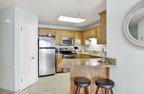 You will be challenged to find a more charming condo featuring 1,064 square feet of beautifully decorated space accommodating up to 8 people! Updated with tile floors, granite countertops and wooden cabinets throughout, everything you need for an unforgettable vacation is thoughtfully provided for you. There is a master bedroom suite and a guest bedroom suite. The master suite features a cozy king bed and direct access to the master bathroom which is equipped with a large vanity and a tub/shower combo with sliding glass doors. Large glass doors provide a beautiful view, allowing an abundance of natural light into the room and leading directly to the patio outside. Two comfortable queen beds are provided in the guest bedroom, located just inside the entry door, which adjoins the guest bathroom featuring a stand-up shower with corner seat and sliding glass doors.