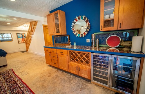 In addition there is a king bedded bedroom and a bunk room on the lower level. Each of the three levels have large, uniquely decorated bathrooms, two with tub/showers and one with just a shower. There is also a half bath on the 1st floor. There are two large entertainment areas on different levels of the house.
