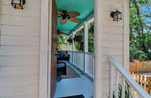 The bungalow's rear terrace is a true gem, with comfortable furniture and a ceiling fan—perfect for unwinding and enjoying Savannah's pleasant climate during your extended visit.