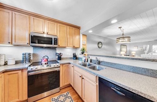 The villa is open and bright with plenty of light and hardwood floors on the first floor. The immaculate, updated kitchen is fully stocked with solid surface counter tops and newer appliances. The open kitchen features a bar height pass through with 3 bar stools adjacent to the dining area with bar height table and seating for 4. The half bath is also on the first level.