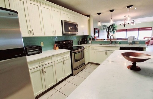 You will feel right at home with the granite counters, new furnishings, fresh paint, jetted master tub and walk-in shower, windows, and a full size washer and dryer. The living room, master bedroom and queen guest room have large sliding glass doors leading to the balcony. Each bedroom adjoins a full bath. The kitchen has full size appliances, including a dishwasher. It is stocked with utensils, dishes and cookware, coffee pot, toaster oven, hand mixer, can opener and more! Bring the food paper and plastic goods or just dine out! There are plenty of options close by!