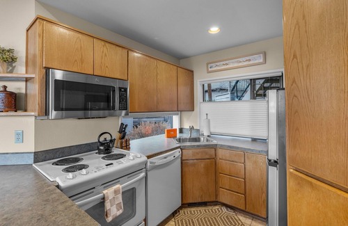 Relax at the Pilot Butte View Retreat, a two-bedroom two-bath in Mt. Bachelor Village Resort, offering stunning views of Pilot Butte and Bend. This lower-level unit accommodates up to 6 guests with a king suite, queen suite, and queen sofa sleeper. The bright, open living area features expansive windows, a new leather sleeper sofa, and a 50” Smart TV above the gas fireplace. Enjoy breakfast on the deck with panoramic views or take advantage of resort amenities like the pool (March-September) and year-round spas.