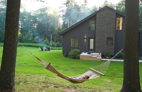 New and improved for 2025. Pinecrest Creek is a modern-rustic, 1600 sq ft cabin on 5 wooded acres with a private trail to the creek. Our expansive 2025 amenity upgrade added a brand-new cedar deck with a cedar hot tub, designer outdoor lounge and dining, Sonos indoor/outdoor audio, a premium Weber grill, a gas fire table (controlled-flame), and a Breeo smokeless fire pit—bringing wellness, relaxation, and boutique-hotel comfort to your Catskills escape from the city.