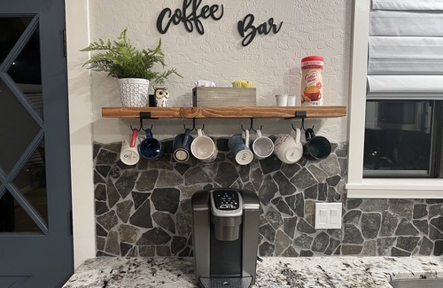 KITCHEN: Fully equipped with granite countertops, extra deep sink, knife set, dishes, pots and pans, toaster, Keurig coffee maker, water filter, and dishwasher.