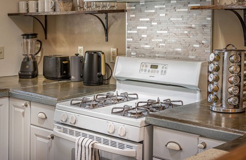 Our kitchen, including all dishes, cooking utensils, and pans, is stocked for your visit. The owners have also supplied a beautiful array of spices for the chef in the family. The dining table provides ample space for eight guests, and a dining table is also offered on the back patio.