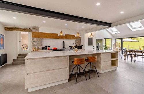 Stepping into the heart of the home where everyone will come together, the large open plan kitchen/ living area fills with natural light from the adjacent bifold doors, whilst the contemporary finishes blend perfectly with the timeless character of a traditional Welsh farmhouse. A feature wood burner creates a cosy nook in the corner of the room, perfect for those slow winter Sundays and the double AGA takes centre stage in the beautiful contemporary, fully equipped kitchen. To keep the little ones occupied inside, there is a separate games room just off the main living space complete with a small pool table, table tennis, games, jigsaws and bean bag chairs. A cosier sitting room can be found on the other end of the property perfect for relaxing after a days adventure. The property also benefits from a large utility room which includes a washing machine, microwave and a downstairs WC. The bespoke feature staircase takes you upstairs, protecting the young ones with safety gates at the top and bottom. To one side of the property, there is a super-king-size bedroom with spectacular views of the surrounding countryside where you can look forward to switching on the TV and enjoying a morning coffee. This bedroom also has the convenience of ample wardrobe space and a large, fresh en-suite with a free-standing bath, walk-in shower and WC. Moving along the corridor you will find both a twin and double bedroom, before arriving at the family suite; complete with a double bed and two singles. Each bedroom has ample storage options so you can truly make yourself at home. To complete the accomodation, there is a large family bathroom with a free-standing bath, separate walk-in shower and WC.