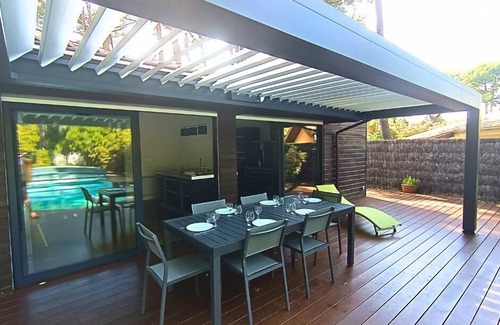 Pleasant spacious and modern villa of 125m² for 8 people, located in a residential area on a fenced and wooded lot. 1.5 km from the center of the resort, nearby mini-market. The main room opens with large windows on a 160m² terrace made of exotic wood, decorated with a heated and covered swimming pool of 8x4 and a depth of 1.20 to 2m. At the rear of the villa, 40m² terrace with garden furniture, barbecue, deckchairs, ping pong table and pétanque court.