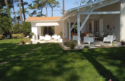 500m from the beach and shops, in a quiet environment, pleasant villa of around 130m² for 7 people, fully renovated with taste, on a fenced and wooded plot of 1100m², covered terrace facing south with garden furniture and barbecue. Possibility to park in the garden. As part of the rental, a departure cleaning is included.