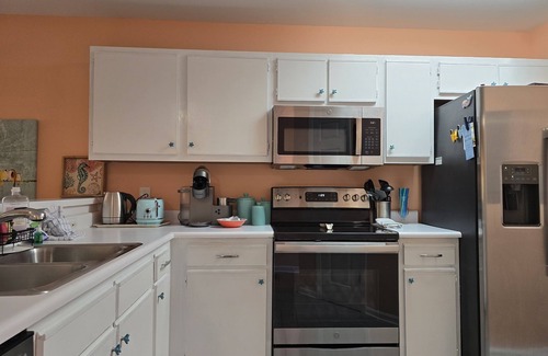 🥄 Kitchen - Updated stainless-steel appliances. Fully equipped kitchen. Counterspace and cabinets for personal essentials. Washer/dryer in a nook behind the refrigerator. Dining area with table seating 4 guests.