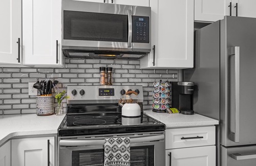- Fully stocked kitchen: stove, dishwasher oven, microwave, coffee maker, toaster, pots and pans, knives, dinnerware and silverware