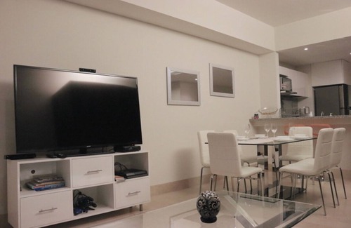 2 bedrooms the principal with a potable baby cot, 2.5 baths, study with a computer and sofa bed, living room with tv, WIFI, PS4. Fully equipment kitchen. 24 hours security.