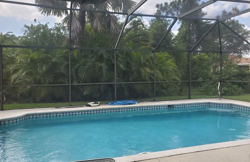 My home is an open floor plan. Tile and wood floors. Televisions in every bedroom and living room. Living room and bedroom opens up to the screened in pool and hot tub. Pool chairs and a large family table are available pool side. All of the exits to the outside leads out to a well kept grass lawn with no neighbors on the back of the property as well as an empty lot on the south side of the property.
