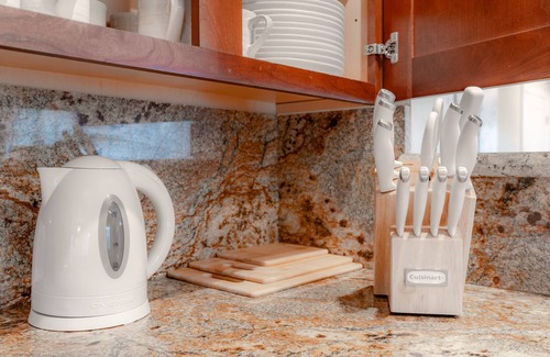 Enjoy a coffee bar complete with Keurig pods, sugar, creamer and a tea assortment.