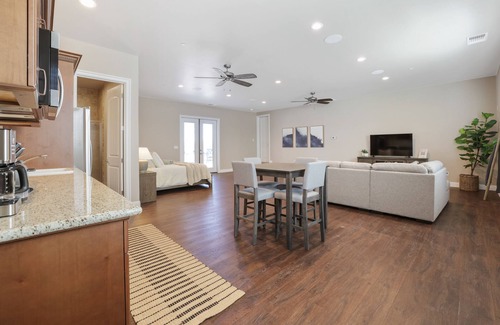 This luxurious poolhouse is connected to an over 3,000 sqft mansion in one of Porterville's best neighborhoods. A private parking spot and separate entrance allow you privacy from the main home. The studio has a well-stocked kitchen with a microwave, oven, fridge, and everything you'll need to cook a meal. A comfy king-sized bed and queen sleeper sectional is perfect for a couple's retreat, two couples traveling together on a budget, or a family of four. There is a full bathroom with outside access to the backyard, perfect for when you're BBQing, laying out, or swimming! The pool house is a studio, so there is no wall between the bed and the living space or kitchen. A double-locking door ensures privacy between the poolhouse and the rest of the home.