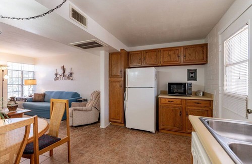 POOL right in front with open view to architectural front-facing villas across the way. The bathroom has a new wall-to-wall vanity with lots of counter space. With amenities like WiFi, AC, and a full-size washing machine. Spacious patio with large grill in front. 3 minute walk Walgreens and the Bank, and across the street from the bank are restaurants, shops and Farmers Market on Wednesday - super easy walk. This is an interior villa and not on the semi-busy street or in the parking area so it is quiet and peaceful. You can't ask for more with location, pool, washer dryer, large counter, and walk to restaurants. Come and stay a while. One person must be 55+.