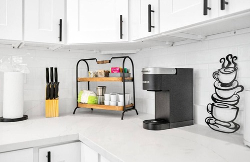 Explore your culinary skills in our state-of-the-art kitchen, equipped with modern stainless steel appliances and a range of cookware.