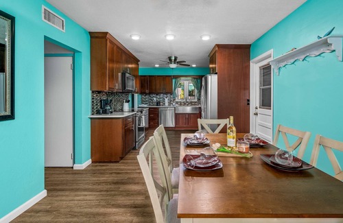 Escape to this vibrant and unique Seminole home, designed for ultimate relaxation and family fun. This property offers a memorable stay with its playful decor, fantastic outdoor amenities, and comfortable living spaces. Challenge your family and friends to a game of cornhole or test your skills on the private putting green. It's the perfect space for sunny afternoons and starry nights.