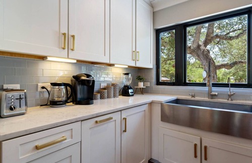 Escape to this 1.5-acre Hill Country oasis with four en suite bedrooms and a bonus playroom with sleeper sofa. Relax by the swimming pool and spa, grill in the large outdoor kitchen, or unwind by the fire pit. Kids will love the treehouse, and everyone will enjoy the open living spaces with scenic views. Just minutes from Dripping Springs wineries, breweries, and hiking trails—perfect for families, groups, and getaways.