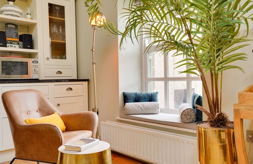 A spacious, beautiful wooden dining table can seat up to four guests opposite a traditional sash window overlooking the gorgeous gardens. The window seat is a perfect sport to curl up with a book or to even sit with a drink and watch the world go by.