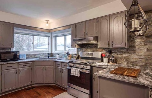 This place is perfect for a large group or family, our back yard is fully fenced in with a large fire pit. Large back deck with gas BBQ. You can relax on our large out door couch while watching the kids soak in the brand new hot tub. Inside this cozy cottage you will find a gas stove with a large eat in kitchen. The main level of the cottage has 2 bedrooms, upstairs kids can share another large play space with 2 more queen beds.