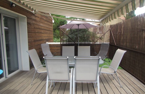 The large terrace is furnished with a garden furniture with 6 armchairs, 4 sun loungers and a awning.