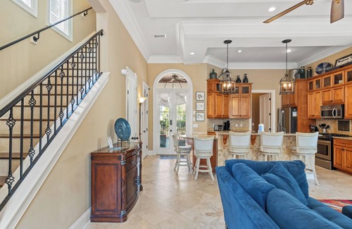 Welcome to Poseidon's Grotto, a luxurious 3-story retreat perfect for your next vacation! This dog-friendly 4-bedroom, 4.5-bathroom house sleeps 12, offering comfort and style for families or groups. The spacious living area on the main floor features an open layout with plush seating, a large flat-screen TV, and beautiful windows that bathe the room in natural light. The kitchen is fully equipped with high-end appliances, granite countertops, and an island with seating for six, ideal for preparing meals and entertaining.