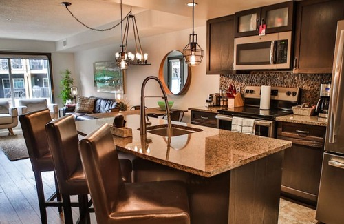 A spacious 2 Bedroom decorated to make anyone comfortable. Modern Cabin vibes give this place an awesome balance. With a fully stocked kitchen you won't be missing out on your home cooked meals after a mountain exploration. Amenities include an outdoor hot tub, gym and paths leading you into nature right from the resort grounds.
