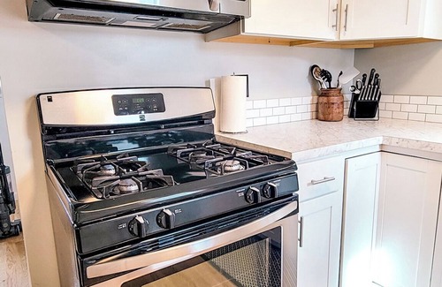 Kitchen is well equipped with the essentials. Gas stove, fridge/freezer w/ ice maker, Keriug coffee/latte and cappuccino maker (including a few k-cups for your first morning), pots & pans, plate and utensils for 6 people and coffee mugs.