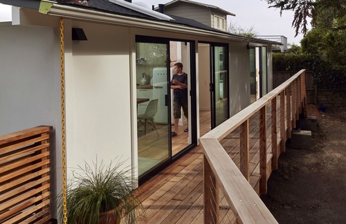 This carefully updated modern bungalow is perfect for a carefree Stinson getaway. With a sunny back yard, and a beautiful view of the ocean through a Eucalyptus grove, this simple property is fun and easy. The open floor plan for the living, dining and kitchen area gives a nice feeling of space, and the chic, modern furnishings are refreshing and comfortable. The deck facing the ocean is directly above a five-acre monarch butterfly forest preserve, and during certain times of the year you will have colorful visitors flying by. This bungalow is pristine. Note: There is a steep stairway from the road down to the house. NO TV. Wood stove, central heating, Charcoal BBQ. Small dogs (under 30 pounds) allowed. Renters bringing pets: Additional pet fee for each pet: $25/night capping out at $150 per week for longer stays, $50 extra cleaning fee. Bed Configuration: 2 Queen Beds