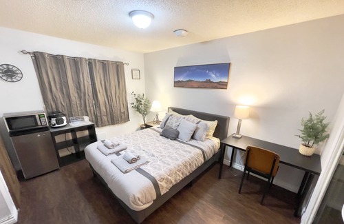 This is a cute 300sf remodeled attached 1BR/1BA guest suite with covered patio. It offers a kitchenette with mini fridge, microwave, instant pot, tea/coffee station, wardrobe, dinette, mini AC, 55" smart TV, IKEA MORABO sofa (genuine leather), fast mesh network WiFi (~450Mbps), comfortable memory foam queen bed, etc.