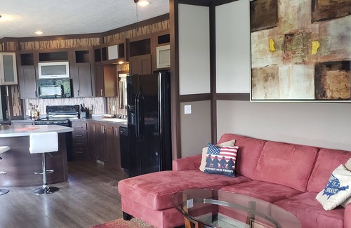 The home is a modern looking fairly new mobile home with a front porch that is perfect for coffee in the morning.