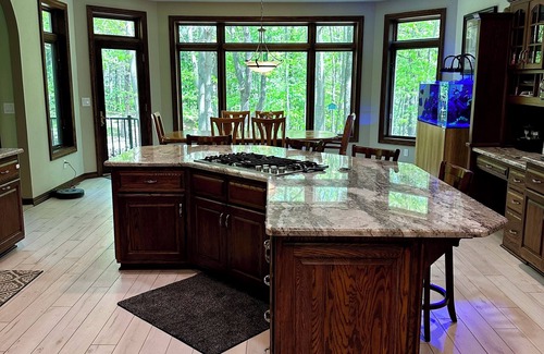 Private 7200 sq/ft mansion 14 min from lambeau field. Tucked away on a 5 acre wooded parcel with no neighbors. 2 bridges cross your private creek with 3 tier waterfall pond as you enter the grounds. Horseshoe driveway on the end of a cul de sac ensure complete privacy. 4 bedroom/4 bath with an enormous kitchen for hosting and grand living room with 20 foot ceilings. Wood burning fireplace as well as pool, foosball, pinball, darts. Private outdoor screen area to entertain w/space to eat/relax.