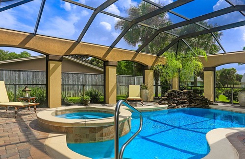 When you enter Bella Rosa you’ll be immediately taken by the spacious and elegant living room with fireplace and a large screen TV. The living room overlooks the outdoor lanai and so you’ll be able to enjoy the waterfall and pool from your living room vantage point. The décor is elegant yet very comfortable carrying on the Tuscan/Mediterranean style of the home.