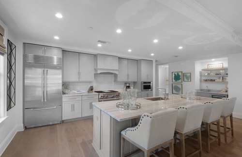 The chef style kitchen featuring WOLF 36" dual fuel range w/infrared griddle, SUB-ZERO 36" built-in refrigerator and SUB-ZERO 36 bottle wine cooler are just a few of the many features of this fully equipped kitchen.
