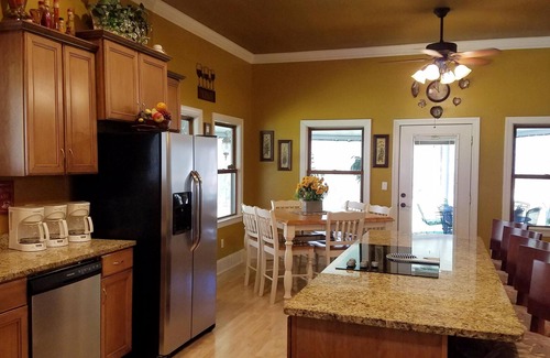 Just wanting to kick back and relax? You can do that in the large family room located on the main level where you can enjoy the stone fireplace, flat screen cable TV, grab yourself a refreshing beverage from the wet bar or maybe a snack from the well-equipped kitchen, featuring all stainless steel appliances, double ovens and beautiful granite counter tops and all the kitchen utensils you will need to make cooking a meal for large groups a breeze, table seating for 16 and bar top seating for 10 with additional seating available, the main floor is also where you will find 1 of the 2 master suites with a large master bathroom that has a deep soak tub and a walk-in shower, the laundry room, and a 1/2 bath are also located on the main floor.