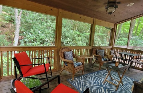 Roberts' Roost Private vacation home is located in the beautiful mountainside, gated Echota Resort. Parking for 4 vehicles at the home. ( a very rare amenity for Echota properties) The home has a 2 car garage with extra storage space for guest's use-store skis, and/or sporting equipment. Open floor plan, with gas logs in great room. Large screened porch, large deck, + covered front porch. Gas grill on deck. Cable TV in great room and main bedroom. 4 bedrooms; 3.5 bathrooms; sleeps 10. Indoor & outdoor resort pools and hot tubs, exercise rooms, billards rooms+other resort amenities. Hiking trails and a lovely river walk in the resort community. The home is nestled in a mountain laurel lush mountainside forest, with partial Mountain Views. Approximately 10 minutes to Boone, 15 minutes to Banner Elk or Blowing Rock. 5+minutes to Valle Crucis. 10 minutes to Ski Hawksnest snow tubing. 15 minutes to Sugar Mountain Ski Resort; 20 minutes to Appalachian Ski Mountain; 30 minutes to Beech Mountain Ski Resort.