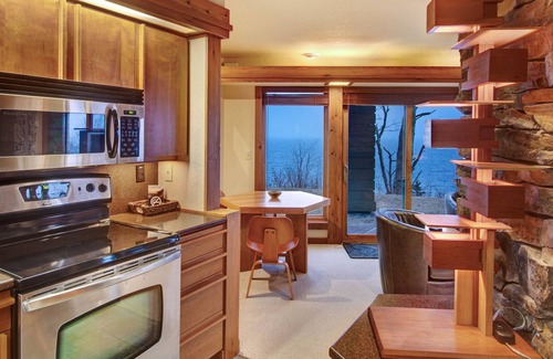 Terrace Point 11B on the shores of Lake Superior is owner-operated. There is no 3rd party or rental company involved. All communication will be directly with us personally and we feel deeply passionate about your comfort and experience. Terrace Point 11B is a popular, in-demand end unit that offers privacy and the ability to walk out to the ledge-rock shoreline of Lake Superior. This luxury, sun-filled, modern Frank Lloyd Wright/John Howe inspired condo has over 26' of floor to ceiling windows and sits on the shore of Lake Superior. Our unit is a one bedroom with a king-size bed, large & private cedar sauna for 2, a gas fireplace framed with North Shore ledge-rock, large bathroom with a 2 person slate, walk-in shower with power jets, a fully stocked kitchen, granite counter tops, cherry wood cabinets and stainless steel appliances, radiant heated floors, a quality sofa and leather swivel chairs in the carpeted living room, dining table, and all the furniture is high-end from Room & Board. This private, end unit sits just 50’ from the shoreline and provides stunning, panoramic views of Lake Superior, morning sunrises, and the stars and moon from every room in the unit. Sliding glass doors walk out to a private patio with a table and chairs that are just steps from the lake. Writers, artists, writers, bird watchers, nature lovers, adventure seekers, music lovers - whether you're looking for a romantic get away, a special place to find your "zen," pursue a wild adventure, explore the Gunflint Trail or the Superior Hiking Trail, learn a new skill at the North House Folk School, experience and shop in the " Coolest Small Town," of Grand Marais or just connect with nature's bounty... this is the perfect place!