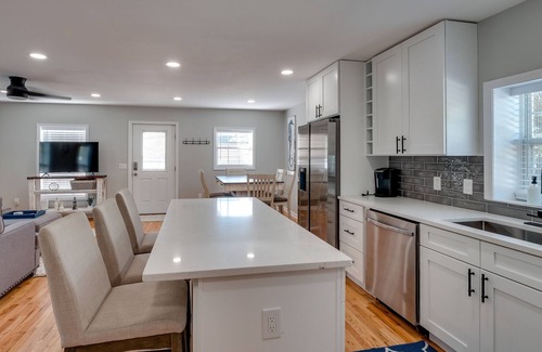 Upstairs, there are two additional bedrooms (with room-darkening shades on the upper windows) and another full, newly remodeled bathroom. The bathroom features double sinks, quartz countertops and a Shower & Tub. The home comfortably sleeps 8, though should you wish to bring a blow-up mattress you could fit up to 10. The bedroom breakdown is as follows: