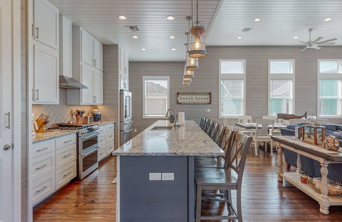 Go Big or Go Home is a comfortable and luxurious 7000 sq ft home situated 0.7 miles from the beach with a private heated pool. This is the perfect place for family reunions, vacations, or group getaways. This home is built on three levels with the main living-dining- kitchen on the second floor. The first and second floors have back, outdoor sitting areas and a view of the pool while the third floor has a front balcony with partial views of the Gulf. The bottom level with stained concrete floors consists of a game room, bathroom, and elevator. The elevator serves all three floors and is activated for handicap access ONLY and with ADVANCED notice to management. The game room has a kitchenette with a sink, mini-fridge, dishwasher, and ice machine. Lounge on the large sectional, (BR5) which converts to a sleeper sofa, while watching your favorite sports or movies on the wall-mounted TV. There are two stools for additional seating. This can be used as a bedroom and play area for children and teens. The full bathroom has a vanity, and tile stand-alone shower with a bench and glass enclosure. Step out the sliding glass door to the backyard oasis. The covered patio makes for easy entertaining no matter what the weather brings with a dining table accommodating seating for eight, an outdoor sectional, a charcoal grill, a wall-mounted TV, fans, and recessed lighting. Cool off in the private L-shaped pool, which can be heated during the winter months for an extra fee, or bask in the sun beside it. When dusk comes, gather around the inground concrete fire pit for smores and stories with ample seating for all. Rinse off in one of the two outdoor showers, one private stand-up and the other open with a bench. Venture up to the second level, adorned in wood flooring, to find the laundry room at the top of the landing. For your convenience, there is a full-size washer, dryer, sink, and cabinets. The half bathroom is off to the side for easy access. Revel in the upscale kitchen with top-quality appliances, all of the cooking utensils you would find at home to prepare your favorite meals, and a deep granite island/bar for prepping with seating for eight. Savor your meals at the stately dining area with seating for eight. Gather on the comfortable sectional and recliners while enjoying views of the outdoors from the long windows along the back of the home and the ambiance of the DaVinci custom see-through fireplace. It has heating and multi-lighting features. Sit out on the back balcony while sipping your morning coffee or walk down the outer staircase to the patio below. All of the bedrooms have extra deep, luxury mattresses, custom built-in nightstands, reading lights, and ensuite bathrooms. On the second floor, the bunk room (BR1) has a King bed, a set of Twin over Twin bunk beds, a wall-mounted TV, a luggage rack, a closet and bathroom with vanity, stand-alone tile shower bench. The guest room (BR2) has 2 sets of custom-built Twin over-queen bunk beds, a wall-mounted TV, a luggage rack, and a bathroom with a tub/glass enclosure. Continue up to the third-floor retreat and you will find a quiet reading alcove area. The private living room is made up of a large couch, TV, and kitchenette with a sink, microwave, cabinets, and wine chiller. Both bedrooms have private access to the front balcony, ideal for unwinding in the ocean breeze and partial Gulf views. The first master suite (BR3) holds a King-size bed, deep closet, wall-mounted TV, luggage rack, and ensuite bathroom with vanity and tile shower with double rain heads. The second master suite (BR4) contains a King-size bed, wall-mounted TV, walk-in closet, and ensuite bathroom with double vanities, tile shower double rain heads, bench, and glass enclosure. This home boasts high-end lighting, fans, appliances, thoughtful custom features, and separate living and sleeping areas to ensure your Port A vacation is tranquil and unforgettable. Come and stay where lasting memories are made, book today.