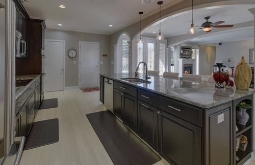 Also, the main floor hosts a Chef’s Kitchen with modern appliances and accessories. An extra refrigerator and freezer are available for additional storage in the laundry room. An office space is provided with wireless internet.