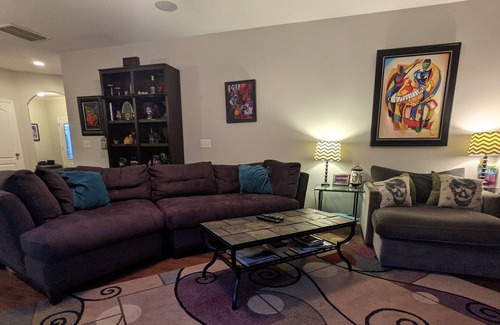 Our home offers spa-like amenities close to all the hubbub of the “big city.” The backyard can be your private oasis as you relax in the enormous Jacuzzi hot tub, swing in the oversized hammock, roast marshmallows in the firepit, or birdwatch from the covered patio. Once indoors, the fun doesn’t stop! We have provided ample seating in the living room so everybody can get comfy and watch a movie on the flat-screen TV or simply spend the evening gazing at the flames in the gas fireplace. Head upstairs and enjoy a game of billiards on the 7’ pool table.