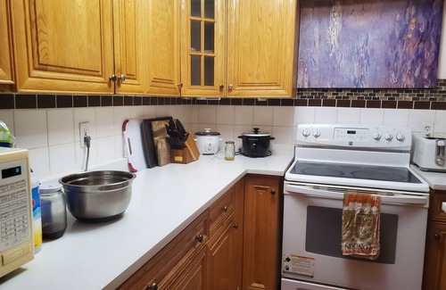 This private large room is on the main floor of a large house. 2 living rooms, full bath and full kitchen with all appliances and small appliances for cooking plus pots and pan for fully equipped kitchen.
