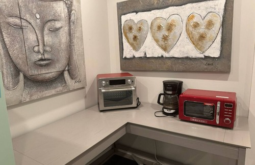 As you enter through your private entrance, there is a spacious living area with 42” cable and wifi TV. The garden queen bedroom is on the left. From there you pass the ocean view queen bedroom onto the open design kitchen, dining area, bathroom and second TV area that overlooks a private 600’ covered patio with views into the 1/2 acre woodlands and onto views of the waterfront. We provide linens, towels, soaps, shampoos and some teas and coffee.