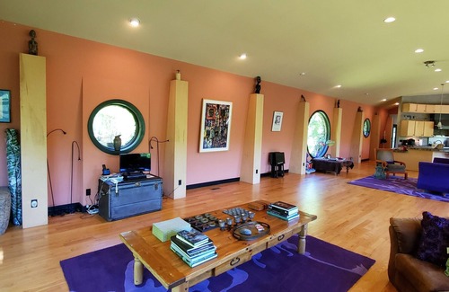Perched on a mountain ledge in the Pennsylvania Poconos, A Loft House on The Delaware, overlooks the Delaware River and is only a 90 mile drive from NYC. A Manhattan artist designed this one of a kind, luxurious home to resemble a Soho loft. Floor to ceiling windows of varying shapes provide breathtaking views on the first floor. The focal point in the great room/living room area is a majestic stone fireplace with a wood burning insert that provides hours of warmth on cold days. Perfect after a day of skiing at Big Bear Masthope which is only a 20 minute drive away.The spacious island kitchen is equipped with Viking gas range. Plenty of dimmer lights over the island counter and recessed lighting under cabinets and the large Island make cooking a joy especially since the Barryville NY, farmer’s market ( summer and fall )is just a 4 minute drive away. The kitchen opens to an outside deck and steps that lead down to the backyard and outdoor fireplace/grill.