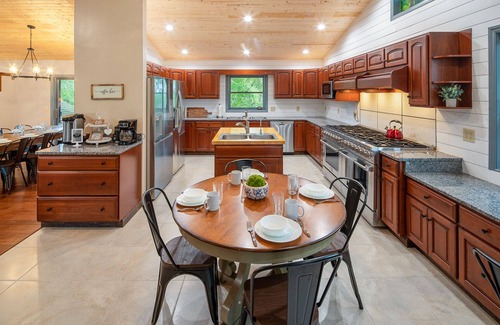 • A dining area with large dining table (seating for 10). A large kitchen with 2 - 36” gas stoves, 2 full size refrigerators, tons of cabinet and counter space, along with a kitchen dining table.