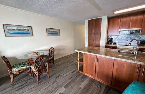 The kitchen is well stocked with all the tools needed for that stay-at-home chef. There is a pantry in the kitchen for storing your grocery purchases. There is comfortable table inside or enjoy meals on the private lanai.