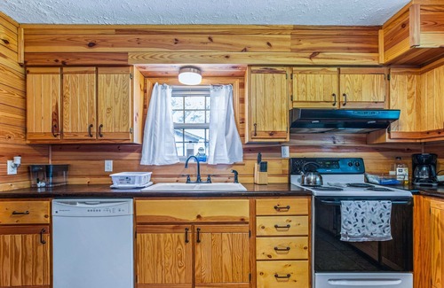 Guests will enter the home through the front door which will open with a digital door code. Once inside, the vintage vibes of the knotty pine walls will welcome you inside. The living room features a queen sleeper sofa and a large SmartTV which opens to the spacious dining room! The fully-equipped kitchen is just off the living space. There is a second living area towards the back of the home which overlooks the backyard and has two futons!
