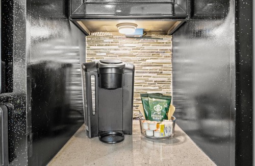 On the first floor, once you pass through the elegant entry, there are one king and two queen bedrooms with two full baths. All bedrooms have wall-mounted TVs. There’s also a convenient laundry area, wet bar, mini refrigerator, and coffee pot. All bathrooms in this home include hair driers, full-length mirrors. The first floor has a private patio, pool, and hot tub, ideal for relaxing. There’s also an outside shower.
